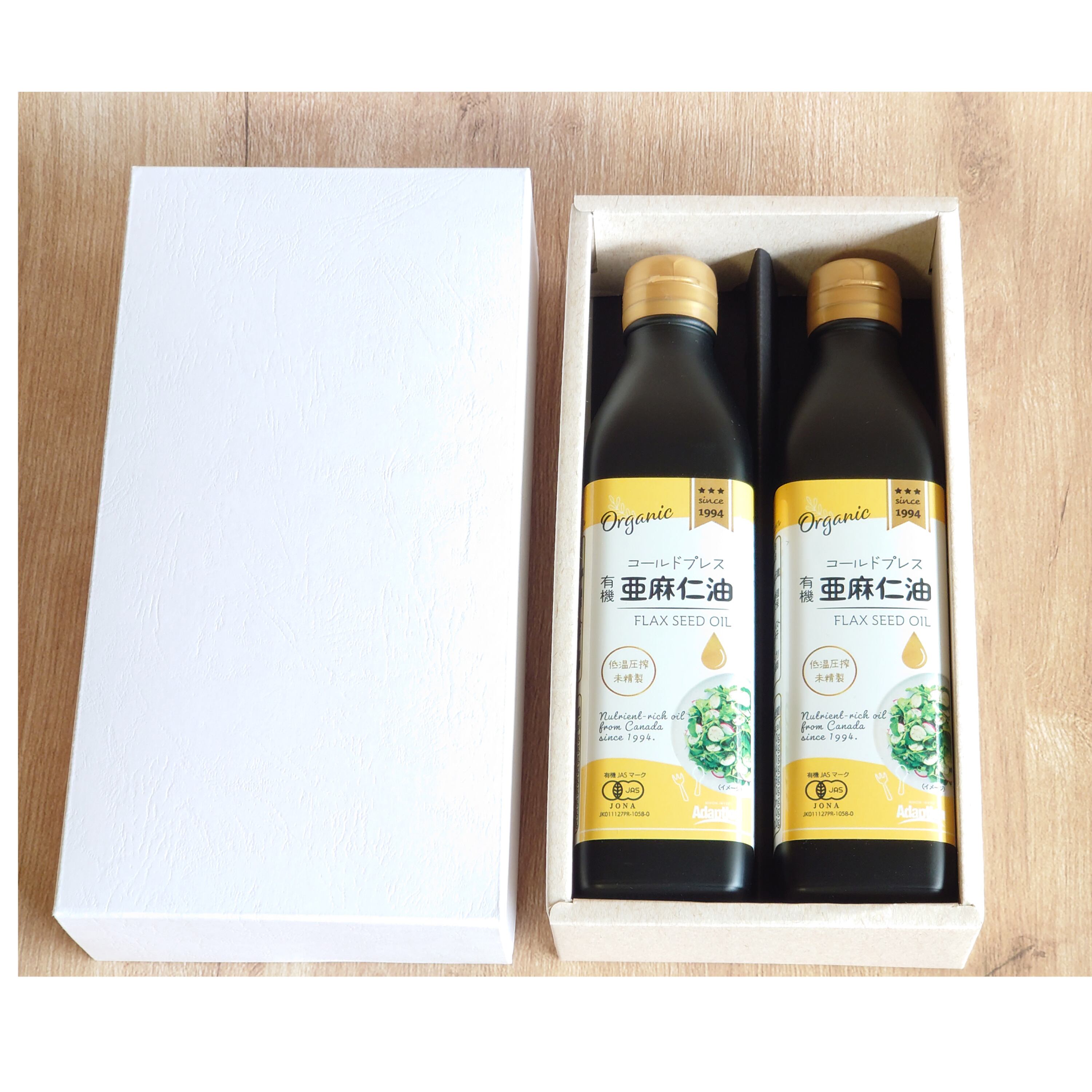 化粧箱入りのコールドプレス有機亜麻仁油2本セットです。