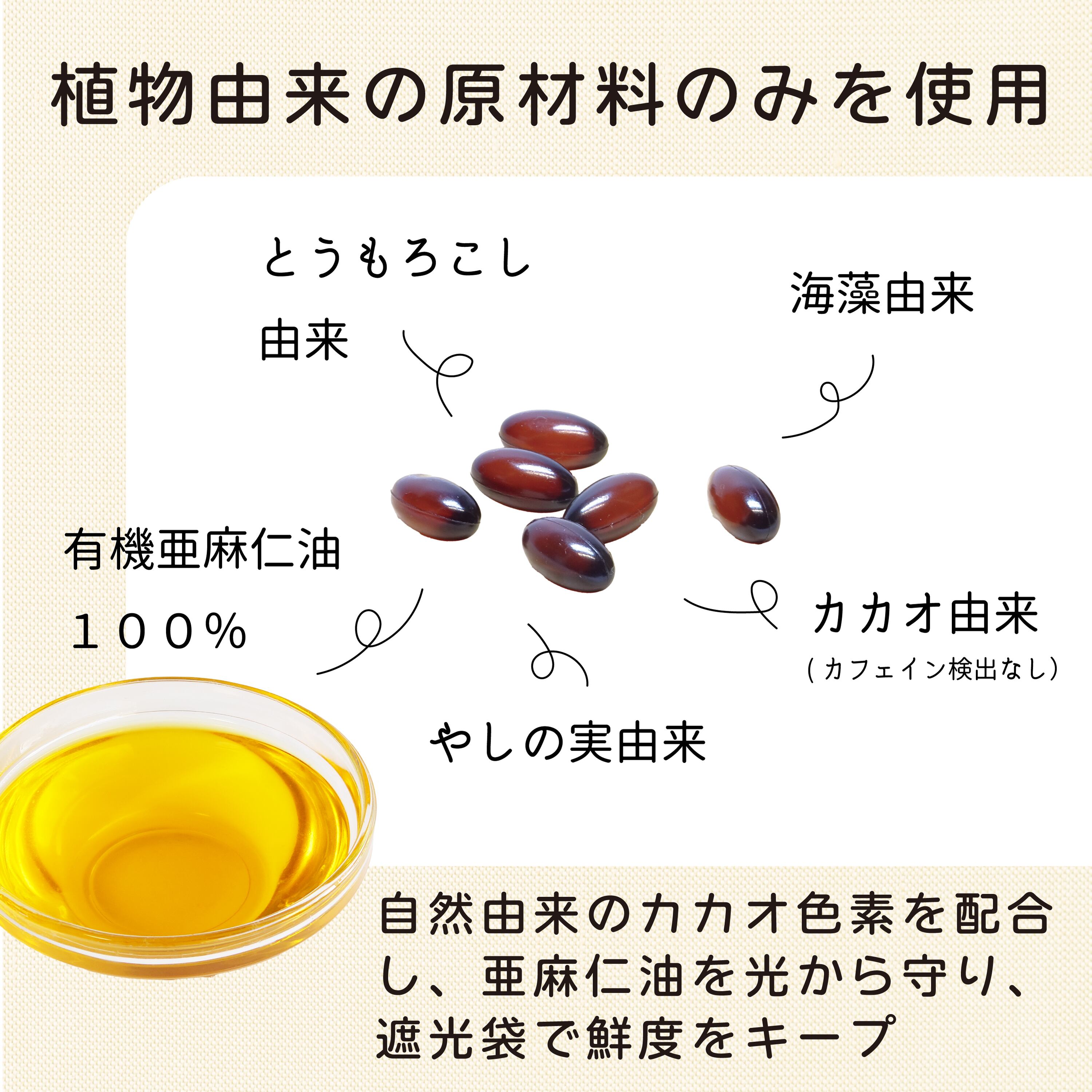 原材料名:食用有機亜麻仁油(カナダ産)/加工でん粉、グリセリン、ゲル化剤(増粘多糖類)、カカオ色素